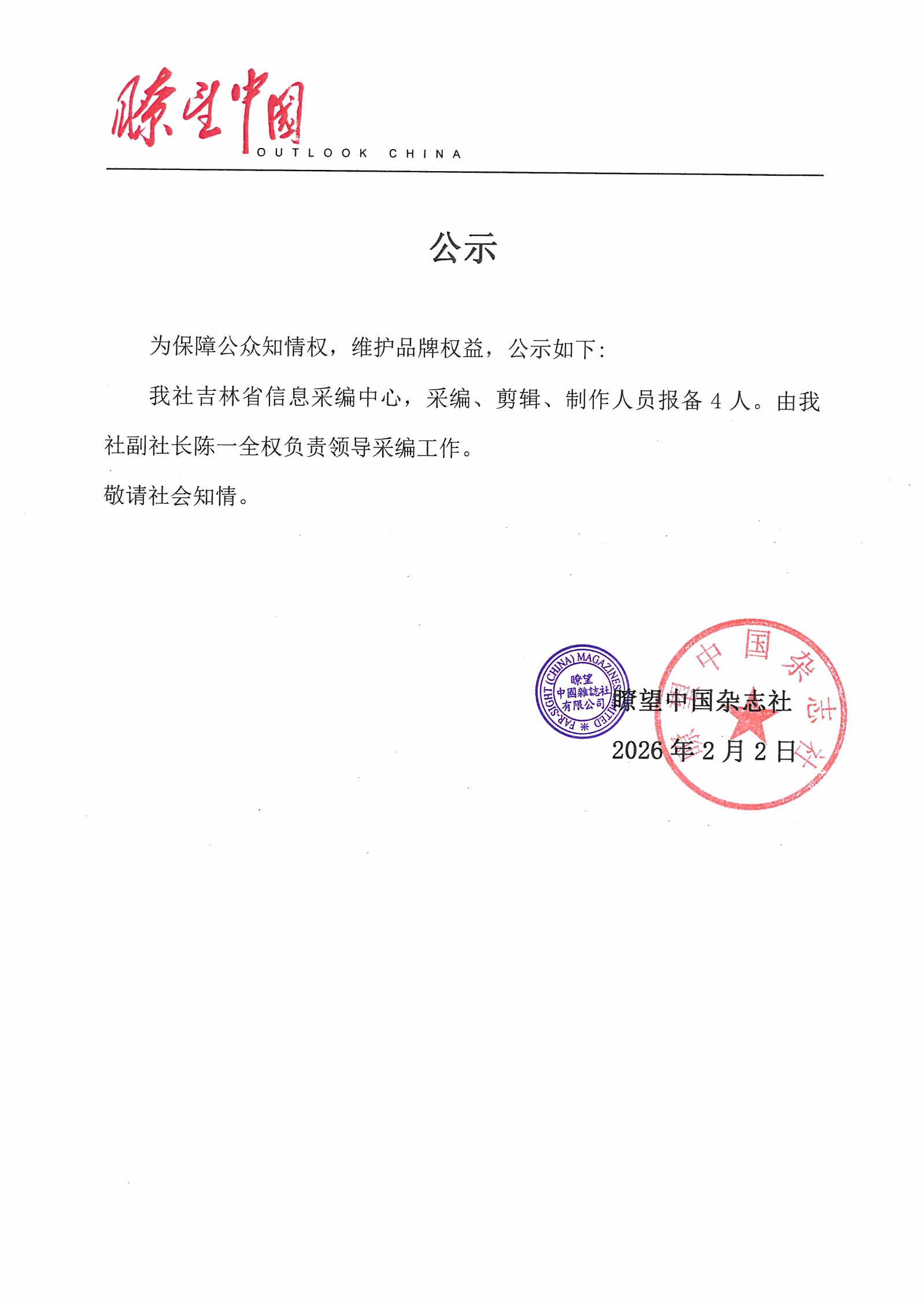 瞭望中国杂志社公示
